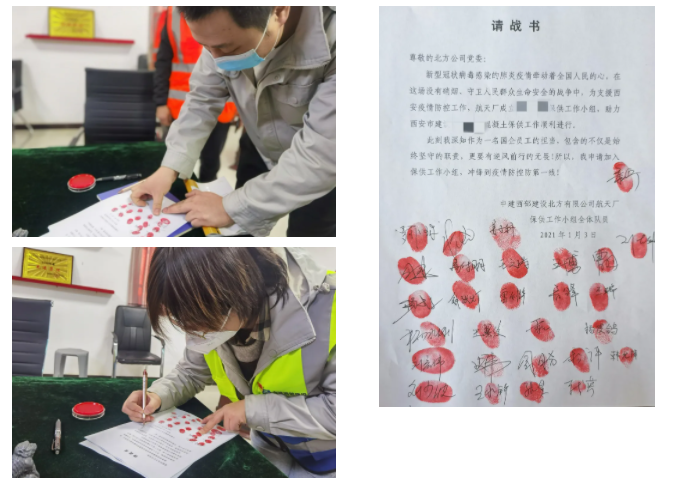 接到供應任務后,航天廠聞令而動,連夜組織所在社區非管控區域的居家辦公人員返崗待命,2小時完成全員核酸檢測工作、8個小時集中全部骨干力量,開啟了北方公司“砼心抗疫”的重要使命。動員會上,28名參戰人員以宣誓、簽署請戰書的方式表達了招之則來,來則必勝的抗疫信念。