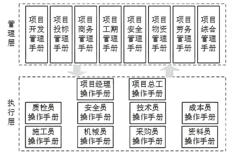 一是設計編制方案。首先,確定標準化體系設計層次。項目管理標準化一般考慮管理者和執行者兩個層面:從管理者層面,主要考慮流程控制和管理無死角;從執行者層面,主要考慮操作手冊、技術方法等施工要素??梢詢蓚€層面并行推進,也可以著重攻克一個層面的問題。其次,設計標準化體系的框架。如果業務類型多元化,例如某大型建筑企業按業務分為房建施工、安裝施工、基礎設施施工、綜合類投資、房地產等,實行分次分批推行項管標準化。業務相對單一的房建企業通常按照工作模塊可分成開發、投標、商務、工期、安全、物資、勞務、綜合等細分篇目,也可按照粗略分為安全文明類、質量類、生產類、綜合類等大篇目。同時,應進一步確定單篇標準化文件的組成部分,通常包括:封面、前言、目錄、目標、適用范圍、引用文件、職責、管理活動的內容與方法、解釋及說明、附錄等。最后,編寫標準化體系的管理規定。采用“計劃、執行、檢查、處理”循環迭代的理念對體系文件的編寫完善等過程作出規定,從而保證標準化體系文件的實用且可更新。此外,還要編寫管理基礎標準,對基礎的術語、圖形符號、數量單位、數理統計方法等進行統一的定義。