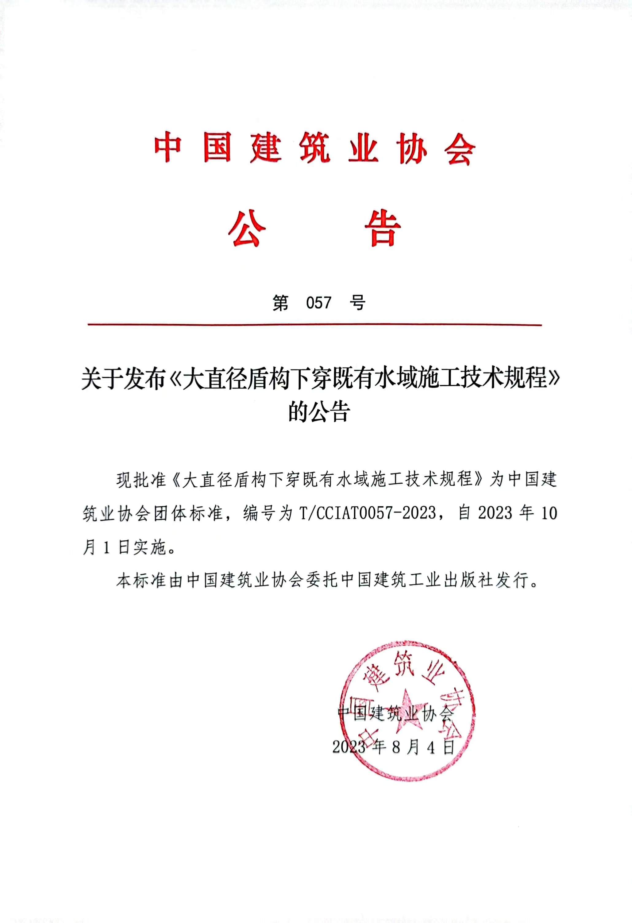 關于發布《大直徑盾構下穿既有水域施工技術規程》的公告