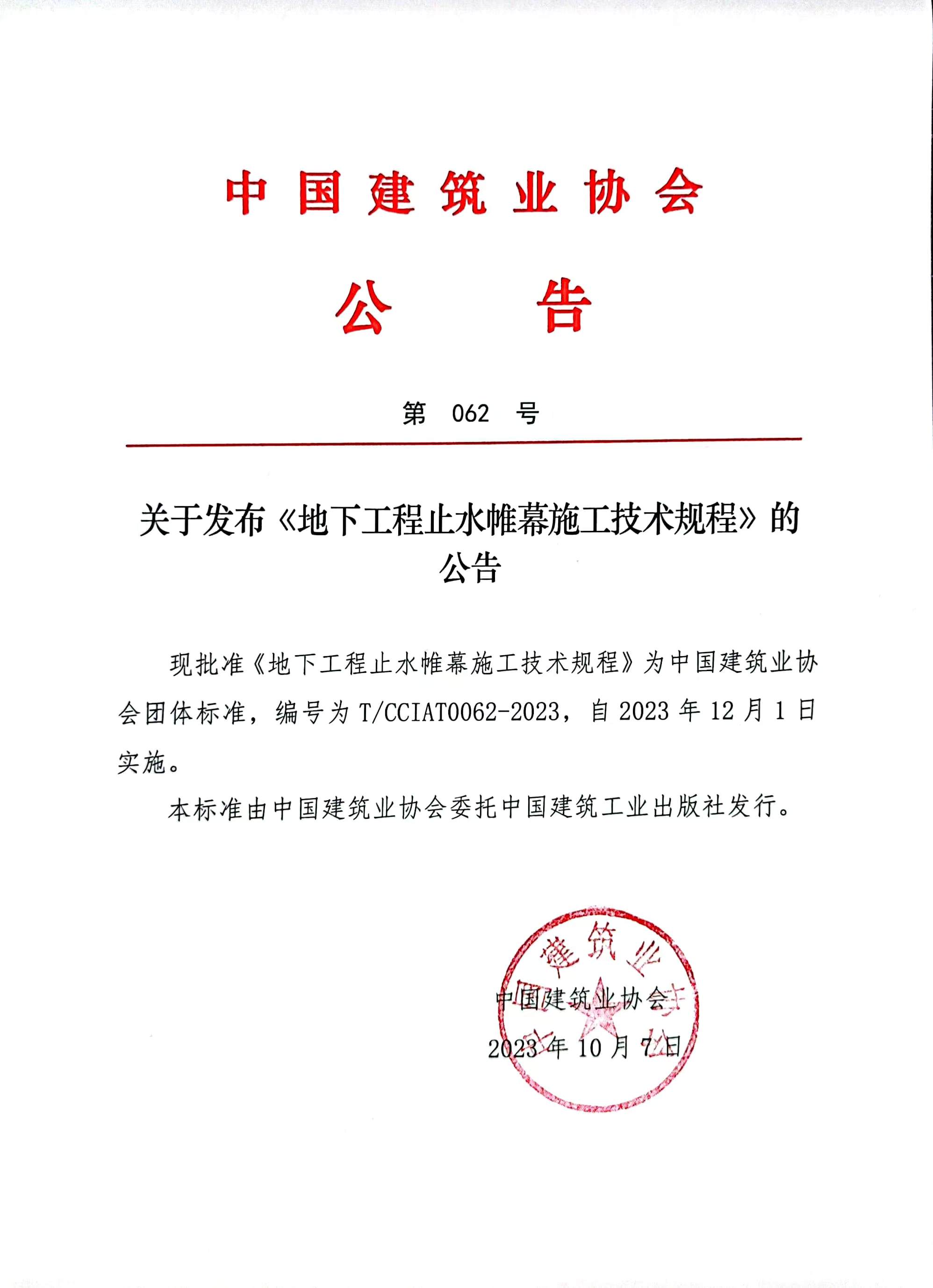 關于發布《地下工程止水帷幕施工技術規程》的公告