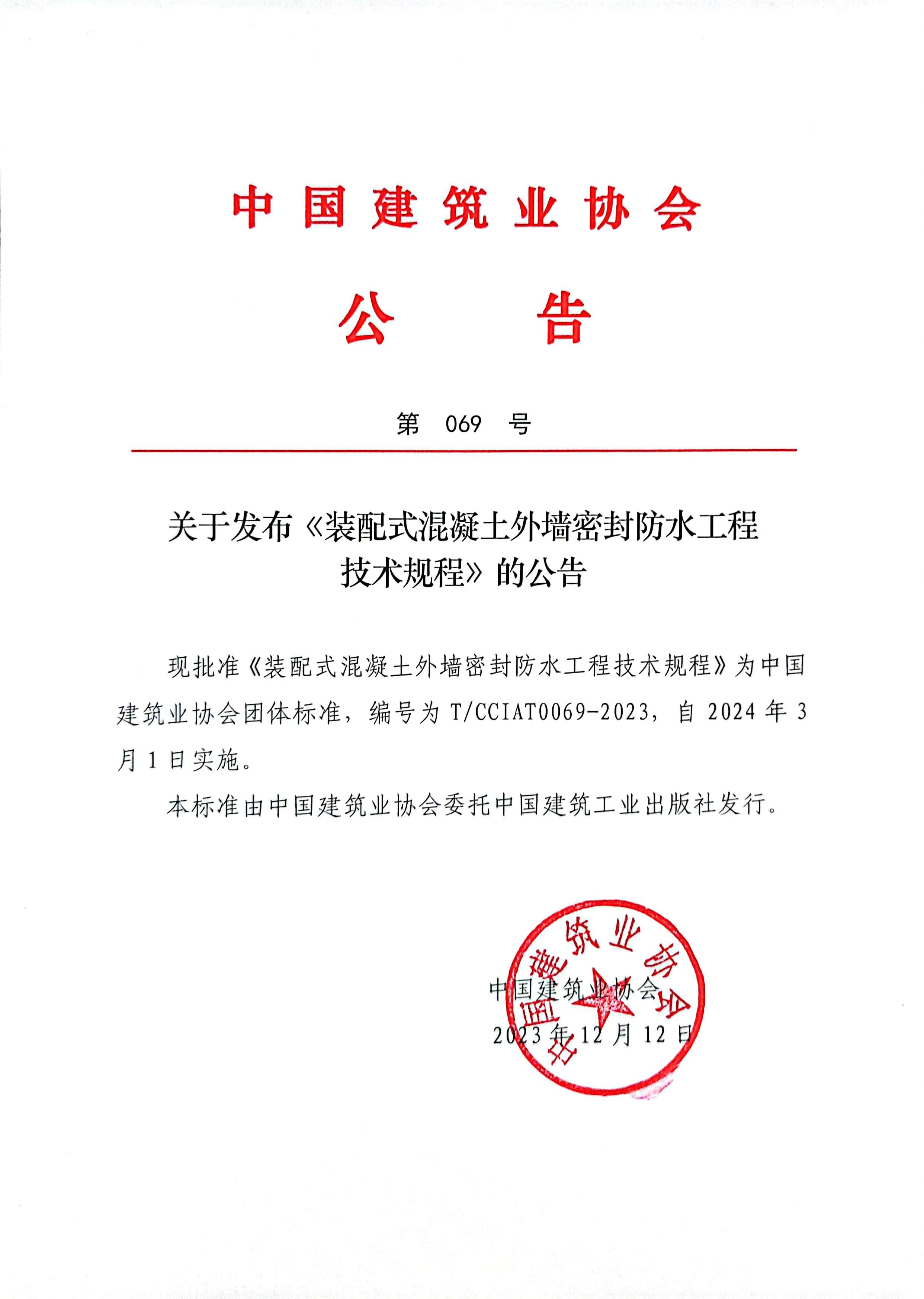關于發布《裝配式混凝土外墻密封防水工程技術規程》的公告