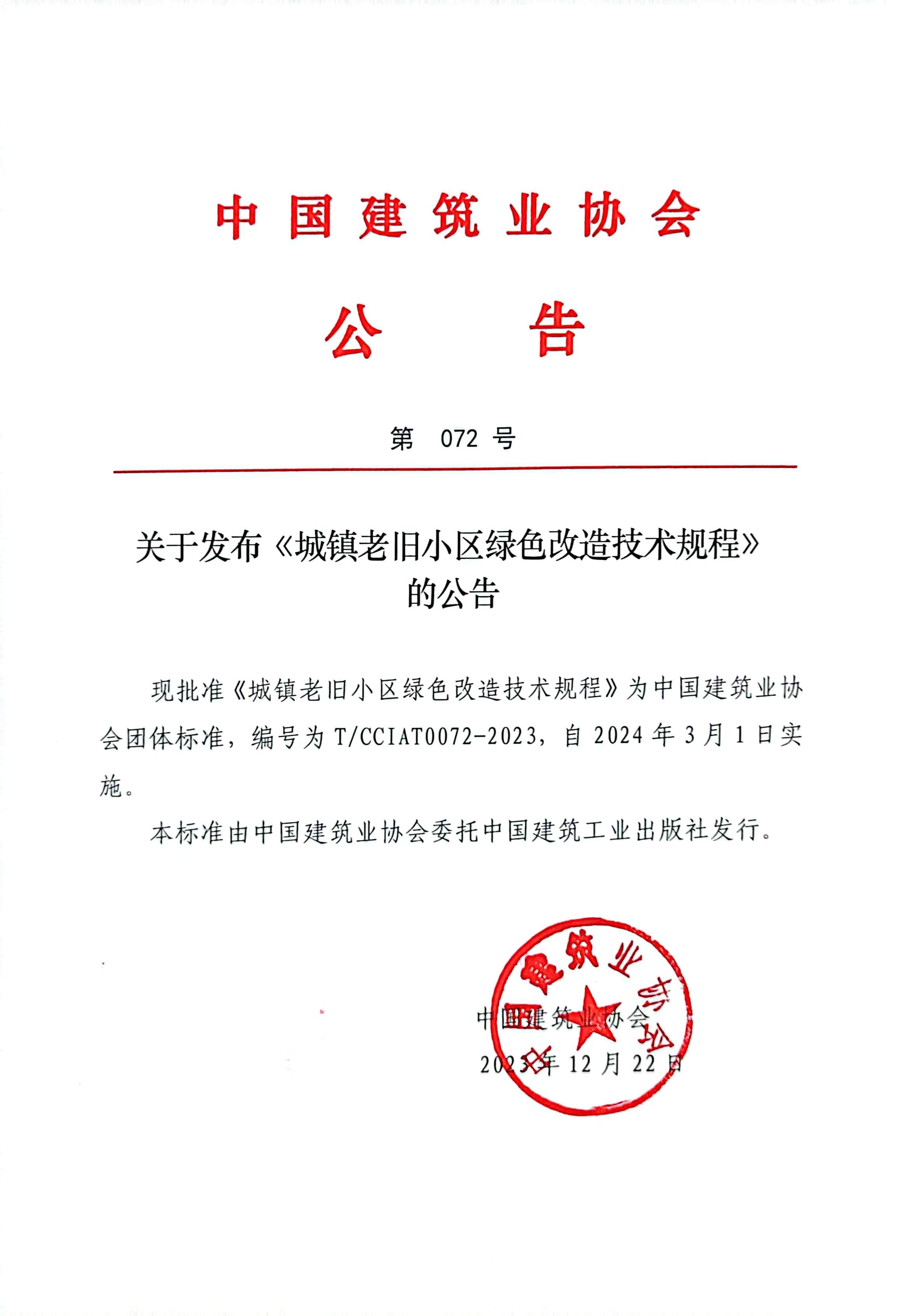 關于發布《城鎮老舊小區綠色改造技術規程》的公告