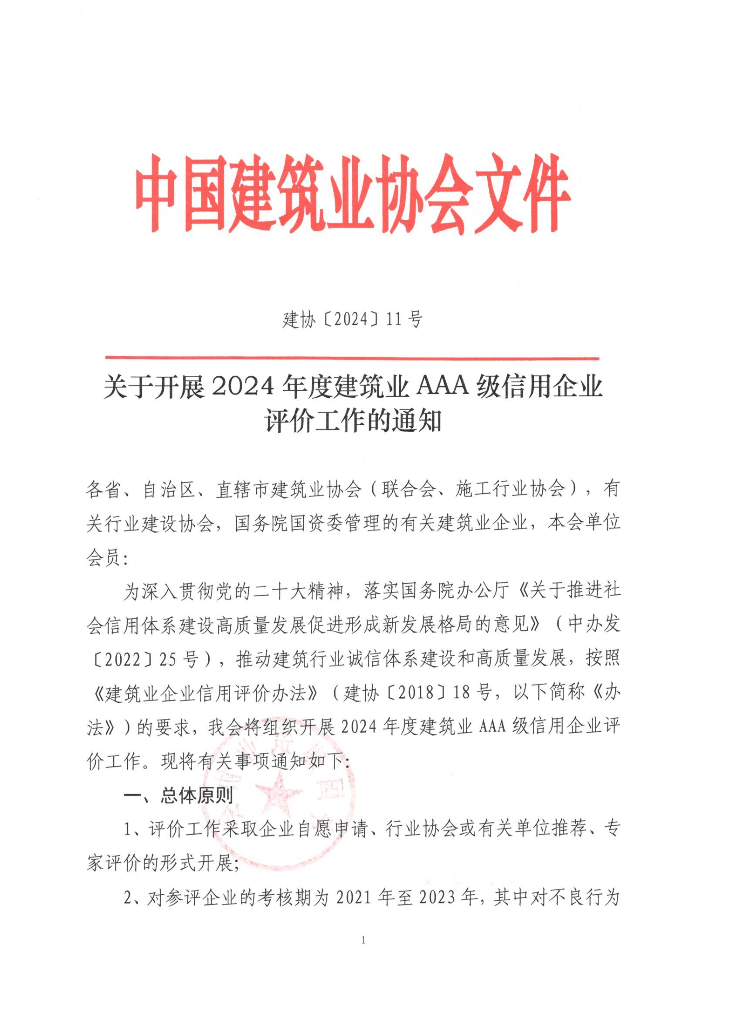 關于開展2024年度建筑業AAA級信用企業評價工作的通知