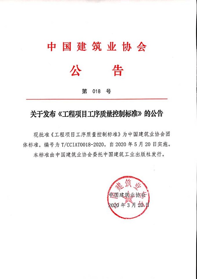 關(guān)于發(fā)布《工程項(xiàng)目工序質(zhì)量控制標(biāo)準(zhǔn)》的公告
