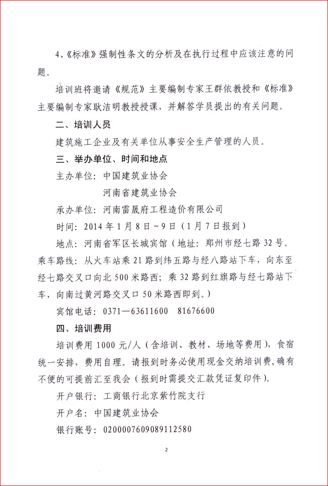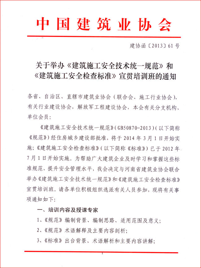 關于舉辦《建筑施工安全技術統一規范》和《建筑施工安全檢查標準》宣貫培訓班的通知