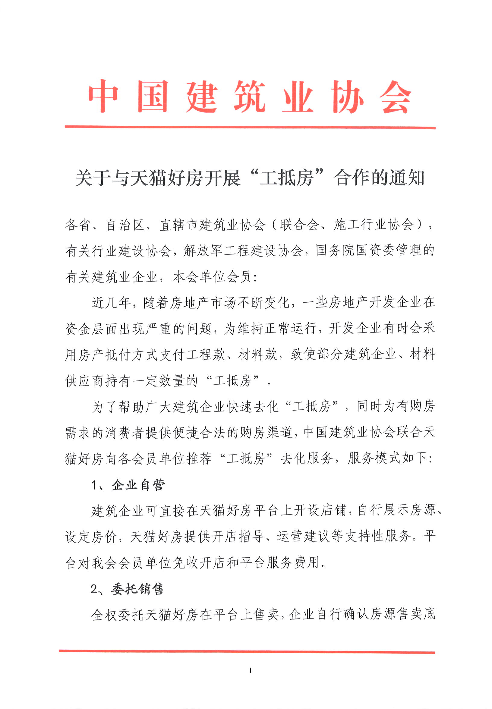 關于與天貓好房開展“工抵房”合作的通知
