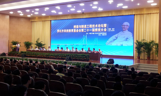 由中國工程院、茅以升科技教育基金會共同主辦的橋梁與隧道工程技術論壇暨茅以升科技教育基金會第二十一屆頒獎大會,6月16日在中南大學舉行。全國政協副主席、九三學社中央副主席、中國科學院院士、基金會主任王志珍,全國政協常委、鐵道部原副部長、中國工程院院士孫永福,湖南省政協副主席張大方,鐵道部原總工程師、基金會常務副主任王麟書,原建設部黨組成員、基金會副主任姚兵,交通運輸部原總工程師、基金會副主任鳳懋潤,北京交通大學教授、中國工程院院士、基金會副主任王夢恕,中南大學黨委書記高文兵,中國建筑業協會副會長兼秘書長吳濤,全國政協委員、茅以升基金會秘書長茅玉麟等700余人出席大會。