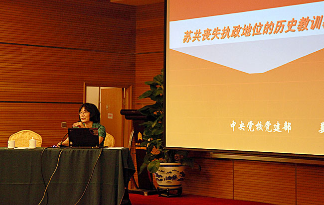 姜躍教授以大量的歷史史料、數(shù)據(jù),講解了蘇共喪失執(zhí)政地位的經(jīng)濟(jì)文化原因(沒(méi)能滿(mǎn)足人民日益增長(zhǎng)的物質(zhì)文化需要)、政治原因(蘇共高度集權(quán)的領(lǐng)導(dǎo)體制)和黨建方面的原因(治黨不嚴(yán)、為政不廉),蘇共改革過(guò)程中的失誤以及蘇共垮臺(tái)、蘇聯(lián)解體的教訓(xùn)與啟示。姜躍教授說(shuō),蘇共垮臺(tái)、蘇聯(lián)解體的教訓(xùn)與啟示主要有三點(diǎn):一是高尚的社會(huì)思想,必須為之而奮斗,爭(zhēng)取實(shí)現(xiàn);共產(chǎn)黨代表人民的利益,人民的利益高于一切,這不應(yīng)該只是口號(hào),而應(yīng)是貫穿在現(xiàn)實(shí)生活中的實(shí)實(shí)在在的行動(dòng)。二是先進(jìn)的思想必須靠科學(xué)的、有效的體制和機(jī)制來(lái)保證它的實(shí)現(xiàn)。三是改革是執(zhí)政黨保持活力和生命力的源泉;同時(shí),改革也是一場(chǎng)深刻而廣泛的“革命”,是一個(gè)歷史進(jìn)程,需要有步驟、有秩序地進(jìn)行;執(zhí)政黨必須在改革中擔(dān)負(fù)起歷史的重任。姜躍教授總結(jié)說(shuō),蘇共領(lǐng)導(dǎo)蘇聯(lián)社會(huì)主義革命和建設(shè)成就是巨大的、失誤是嚴(yán)重的、后果是慘痛的、教訓(xùn)是深刻的,我們黨要引以為戒。姜躍教授的講課,獲得在場(chǎng)全體聽(tīng)眾的熱烈掌聲。