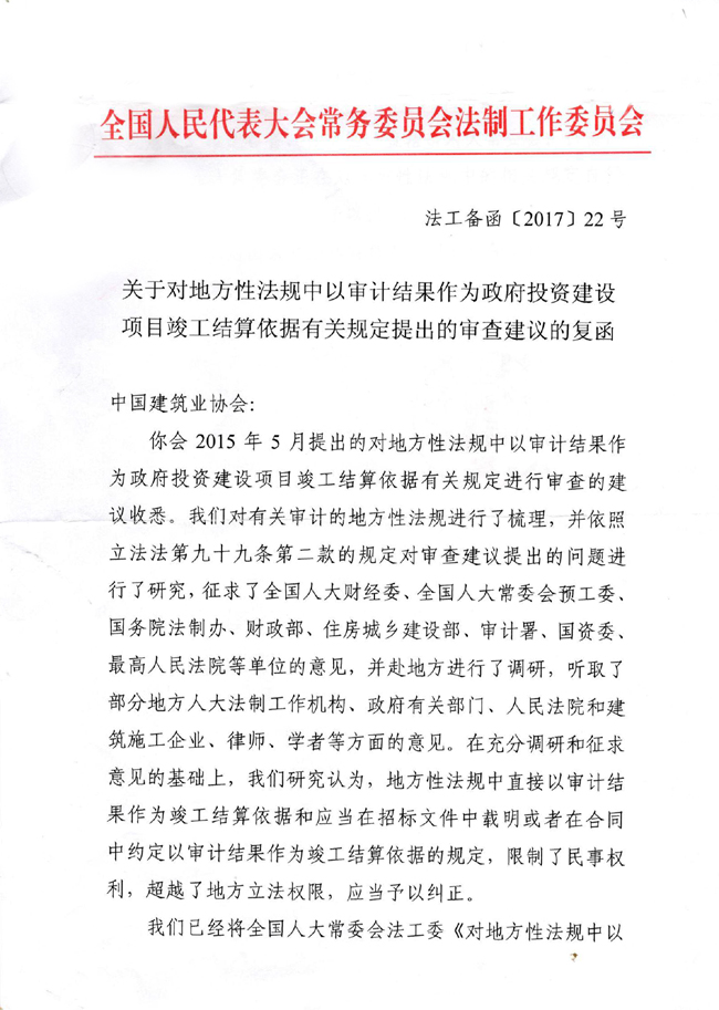 至此,我會聯合有關協會共同申請對規定“以審計結果作為工程竣工結算依據”的地方性法規進行立法審查的工作取得了圓滿結果,有力維護了建筑業企業的合法權益。