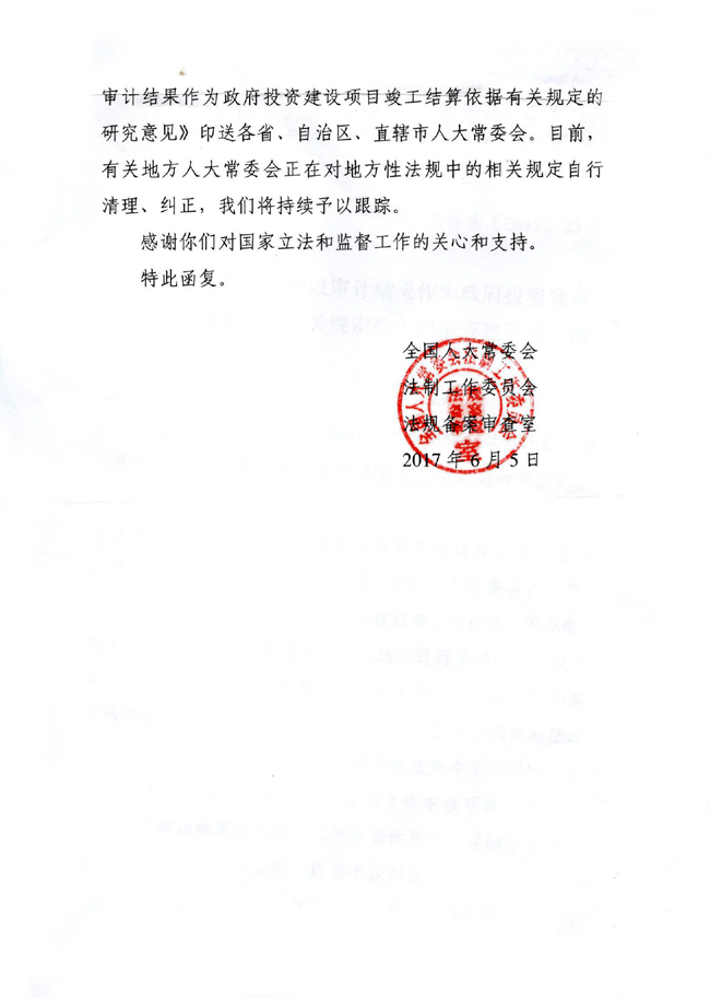 6月5日,我會收到法工委《關于對地方性法規中以審計結果作為政府投資建設項目竣工結算依據有關規定提出的審查建議的復函》。《復函》提出,在收到我會于2015年5月提交的《關于申請對規定“以審計結果作為建設工程竣工結算依據”的地方性法規進行立法審查的函》后,法工委經過充分調研和征求意見,認為地方性法規中直接以審計結果作為竣工結算依據和應當在招標文件中載明或者在合同中約定以審計結果作為竣工結算依據的規定,限制了民事權利,超越了地方立法權限,應當予以糾正。2月22日,法工委印發《對地方性法規中以審計結果作為政府投資建設項目竣工結算依據有關規定的研究意見》,要求各省、自治區、直轄市人大常委會對所制定或者批準的與審計相關的地方性法規開展自查,對有關條款進行清理糾正。6月13日,應法工委邀請,我會有關負責同志赴法工委辦公室聽取了此項工作的開展過程和最新進展情況,了解到各地現已完成自查,對相關條款的清理修訂工作亦在抓緊落實。