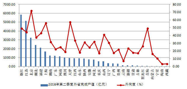 圖4  2018年上半年各地區跨省完成的建筑業總產值及外向度