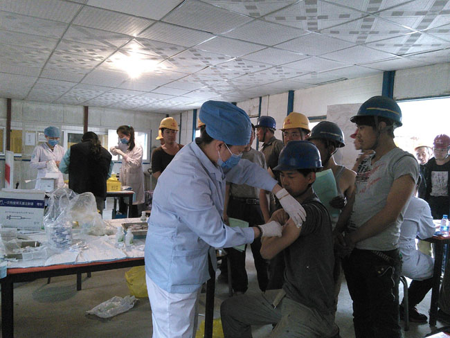 在項目部職工的配合下,防疫站一行9人為現場200多名農民工注射了疫苗,并現場發放宣傳冊,同時向工人們宣傳了禽流感、麻疹、流腦等傳播性疾病預防知識,為廣大農民工及周邊群眾筑起了一道健康防線。