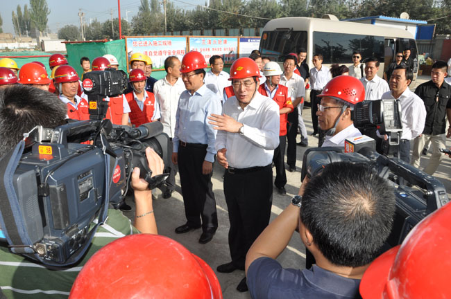 9月12日,中共中央政治局委員、市委書記郭金龍率領的北京市代表團同中共中央政治局委員、新疆維吾爾族自治區黨委書記張春賢一行在新疆和田地區進行對口援疆考察,在北京市投資規模最大的對口援建項目——和田市北京醫院建設工程施工現場,代表團聽取了北京援和指揮部副指揮劉曉光對北京市醫療援疆工作的介紹,和田市北京醫院項目部項目經理閻洪浩匯報了工程整體建設情況,并帶領代表團參觀了工程建設,郭金龍和張春賢親切的與援疆建設者代表合影留念。