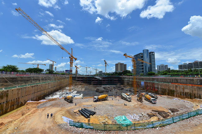 據(jù)北京建工集團(tuán)海口雙子塔.南塔項目部執(zhí)行經(jīng)理苑會杰介紹“一是該工程總建筑面積38.81萬平方米,主塔樓高度為428米,塔樓地上94層,地下4層;二是海口地區(qū)屬地震設(shè)防高烈度區(qū)和強(qiáng)臺風(fēng)區(qū),塔體設(shè)計抗震8度半,以防地震可能對高樓造成的損害,僅單塔的樁數(shù)就多達(dá)1993根,是上海中心大廈的2倍有余,且單樁承載力是上海中心大廈主樓抗壓樁的2倍,樁深達(dá)到88米-102米;三是海口雙子塔南塔基坑是全球少見的超深、超大的單體建筑基坑,最深處達(dá)25米,基坑占地面積達(dá)7000㎡,僅土方量就達(dá)到70萬方,該面積相當(dāng)于一個標(biāo)準(zhǔn)足球場大小;該工程塔樓底板基礎(chǔ)為樁筏基礎(chǔ),塔樓基礎(chǔ)底板混凝土強(qiáng)度等級為C50,抗?jié)B等級為P10,墊層為100mm厚C20混凝土,塔樓底板平面面積約為8600平方米,底板由四周到中間厚度分別為0.7米-8.5米,底板最深8.5米,海口雙子塔.南塔已于2016年底完成大樓地下部分樁基工程施工,本次施工主要任務(wù)即向地下樁基部分澆灌混凝土,以確保塔基穩(wěn)定性,此次南塔塔樓筏板基礎(chǔ)單次澆筑混凝土9.6萬噸,將創(chuàng)海南地區(qū)之最,是一個建筑業(yè)矚目的“超級工程”。