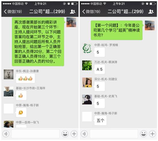 今年9月份是二公司第五個新員工學(xué)習(xí)“陳超英精神”讀書月,相比以往,今年通過微信群發(fā)布“超英微讀者計劃”活動,作為二公司首次推出的基于微信社群的讀書活動,“超英微讀者計劃”一經(jīng)推出即贏得了廣泛好評,新員工紛紛點贊,踴躍參加。活動通過發(fā)布每日話題,開展主題討論,邀請公司領(lǐng)導(dǎo)、優(yōu)秀業(yè)務(wù)骨干開展專題講座、互動交流及知識問答等環(huán)節(jié)增強整個活動的趣味性,應(yīng)用微信管家輔助軟件記錄群成員的活躍情況,并通過“微積分”方式建立學(xué)習(xí)成長卡,作為后期“超英微讀者計劃”閱讀小達(dá)人評選依據(jù),切實增強全員閱讀的積極性。