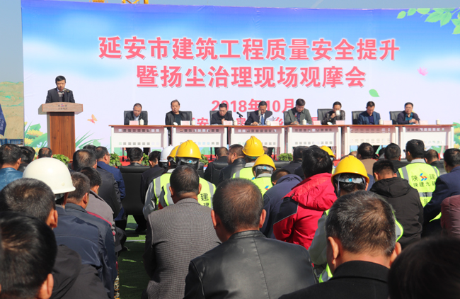10月24日,延安市建筑工程質量安全提升暨揚塵治理現場觀摩會在陜建九建集團承建的延安博物館項目舉行。延安市建規局、市安監局、市質監站、市建筑業協會,建筑施工單位、監理單位共300余人參加。陜建九建集團常務副總經理王彤受邀分別從安全生產、質量管控、揚塵治理、綠色施工等方面做了經驗交流。