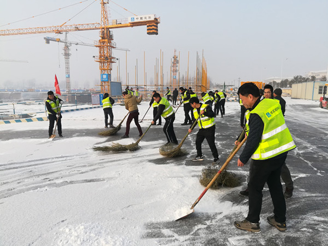 項目大清掃活動按照分工分為兩組,一組為除冰組,負責清除道路結冰;二組為清掃組,負責清掃道路積雪;兩組相互配合、共同協作,經過近兩個小時的清掃,道路已經完全清掃干凈、暢通無阻,不僅保證了行人、車輛的安全,同時也增進了大家學習交流、互幫互助的團隊凝聚力、號召力、戰斗力。通過開展雪后大清掃活動,為揚塵管控解禁后迅速投入施工生產打下良好基礎,為鄭州打贏藍天保衛戰“三年行動”貢獻力量。