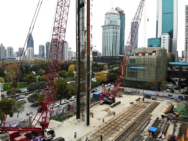 地下分項工程體量大,工期緊,質量要求高。支護、樁基、土方等工程造價已達1億多元,僅連續(xù)墻、樁基、鋼筋砼支撐的鋼材用量就達5000多噸,混凝土用量約為30000多立方米。基坑支護采用兩墻合一地下連續(xù)墻,厚度為1000毫米和800毫米,成槽深度可達50余米,在武漢地區(qū)極為少見。每幅鋼筋籠長達50米(約15層樓高),單幅鋼筋籠重量約52噸。其中地下連續(xù)墻混凝土強度等級為水下C35P10,具有水下不分離、自密實性、低泌水性和緩凝等特點,這對成槽后混凝土限時澆筑要求非常嚴格,且地連墻僅上部28米進行了三軸攪拌樁加固,下部易發(fā)生塌孔。項目部管理人員自行研制了深處泥漿取樣器,更客觀、便捷地檢測了深處泥漿指標,施工過程中未發(fā)生塌孔現象。地下連續(xù)墻原設計74幅,經項目部研究后和設計單位溝通,優(yōu)化為70幅,鋼筋籠兩次吊裝拼接改為一次性整體吊裝。不僅有效保障施工安全也提升了施工效率,節(jié)約建設成本20余萬元,取得雙贏的效果。最終,70幅地連墻歷時122天全部順利完工,比原計劃提前25天。