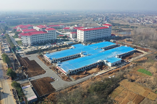 倉頡山病區(qū)占地28畝,建筑面積6100平方米,東西長120米,南北81米,其場地有將近3米的高差。與疫情斗爭,拼的是速度,爭的是時間。數(shù)十臺臺挖掘機、推土機、自卸車等施工機械聞令而動,第一時間從全市各處趕來,開始了場地平整、土方外運等工作,2個不眠的日夜,近30000方的外運工作全部完成。2月6日,正直會戰(zhàn),又遇陰雨連綿,場地濕滑,130名鋼筋工人冒著惡劣天氣,開始了基礎(chǔ)鋼筋綁扎工作。150噸鋼筋在200多名鋼筋工的努力下,從制作到綁扎僅僅用了1天半的時間;2000方混凝土于2月8日晚全部澆筑完成,并連夜開始了128個集裝箱的吊裝工作,為各參建單位順利施工奠定了堅實的基礎(chǔ)。