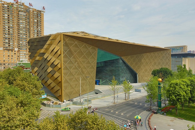 成都博物館新館建設(shè)工程位于天府廣場西側(cè),是國內(nèi)首個進行文物安全防震設(shè)計的博物館,總建筑面積6.5萬㎡,系目前唯一采用混凝土核心筒+鋼框架+鋼網(wǎng)格為結(jié)構(gòu)體系的博物館;外立面為銅板+銅網(wǎng)+玻璃幕墻,是世界上最大的盒體銅板幕墻建筑。