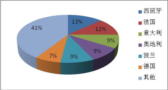 歐盟內部既擁有多元化的建筑巨頭,也包含一些規模較小的承包商,這體現出整個歐盟承包商結構成熟、產能規模可觀。由于歐盟承包商實力強大,歐盟90%的項目由自己的承包商占據。其中西班牙和法國承包商占比超過25%,意大利、奧地利和波蘭的承包商也承擔了大量建筑項目。歐盟以外的承包商以瑞士、美國和英國為主,大概承擔3%的項目。