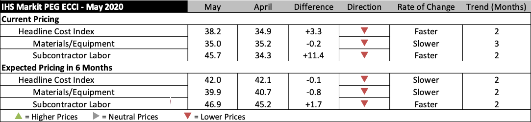 NEW YORK (May 27, 2020) – Engineering and Construction costs fell in May, according to IHS Markit (NYSE: INFO) and the Procurement Executives Group (PEG). The current headline IHS Markit PEG Engineering and Construction Cost Index registered 38.2 in May, a slight increase over last month’s figure of 34.9, but still well below the neutral mark of 50, indicating falling prices. The materials and equipment portion of the index came in at 35.0 with the sub-contractor portion at 45.7.
