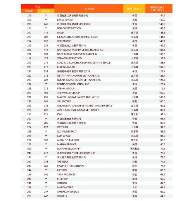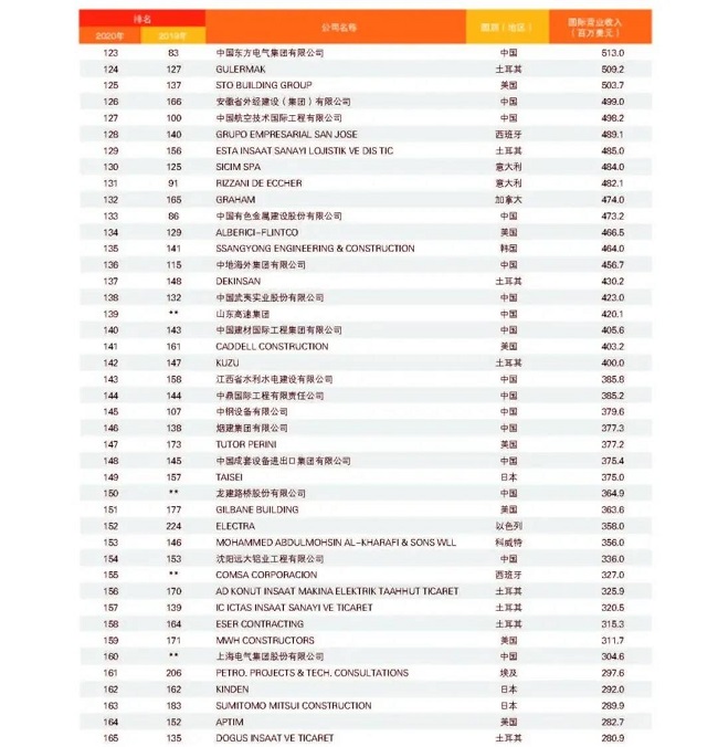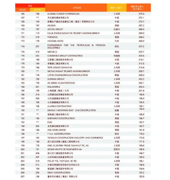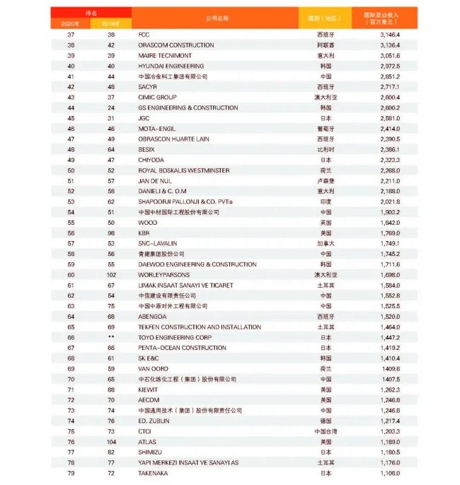 從中國企業(yè)來看,共有74家企業(yè)上榜,較上一年度減少1家,主要原因是部分企業(yè)實施了合并重組,由母公司統(tǒng)一參評。與2019年度相比,入圍今年“全球最大250家國際承包商”的74家中國企業(yè)中,有37家排名上升,其中上升幅度最大的為北京城建,排名從第154位上升至第105位,其次為安徽外經(jīng),排名從第166位上升至126位;27家企業(yè)排名下降;2家與2019年度排名持平;新上榜企業(yè)8家,分別是山東高速集團(tuán)、龍建路橋股份有限公司、上海電氣集團(tuán)股份有限公司、天元建設(shè)集團(tuán)有限公司、湖南建工集團(tuán)有限公司、江西省建工集團(tuán)有限公司、南通四建集團(tuán)有限公司、河北建設(shè)集團(tuán)股份有限公司。在新上榜企業(yè)中,山東高速集團(tuán)與龍建路橋表現(xiàn)較為亮眼,進(jìn)入排名前150強,排名分別為第139位和第150位。